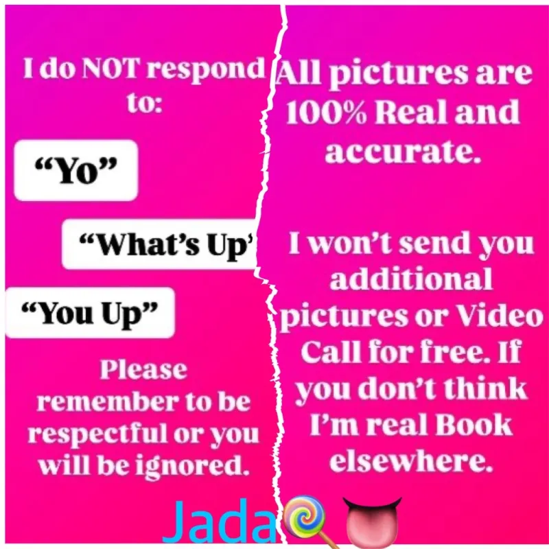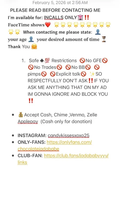 ๐ฆLapDance/StripTease ๐ฏ๐๐พ๐น๐ธ๐ฝFACETIME SHOWS AVAILABLE ๐นI DO NOT ๐ซ SEND PICTURES OR VIDEO VERIFY FOR FREE โผ All exchanges are done for my TIME!! โฐ TEXT FOR A FASTER RESPONSE โผ * INSTAGRAM: candykissesxoxo25 * ONLY-FANS: https://onlyfans.com/chocolatejadababe * CLUB-FAN: https://club.fans/jadababyyyy/links